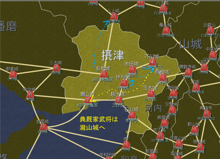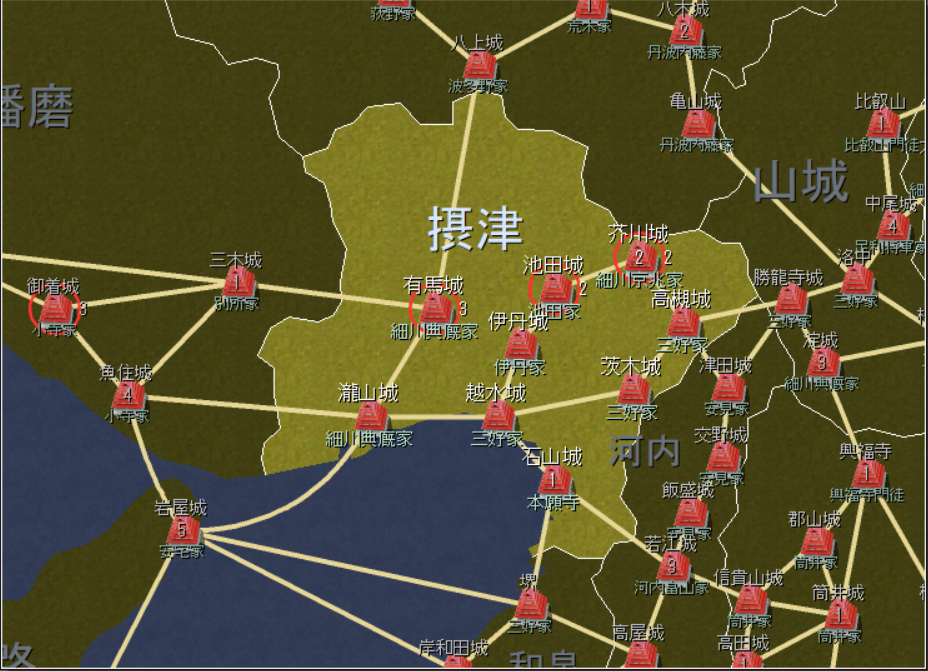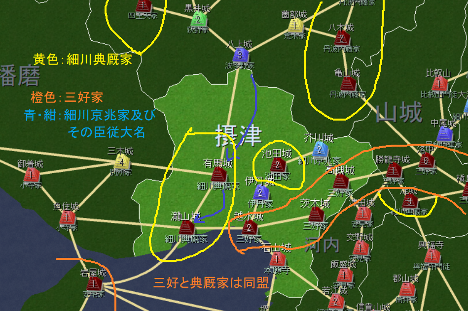 - 三好家は初期段階で3つ(本体らがいる山城-摂津、安宅家ら淡路-和泉、そして画像には入らない阿波)に分かれている。