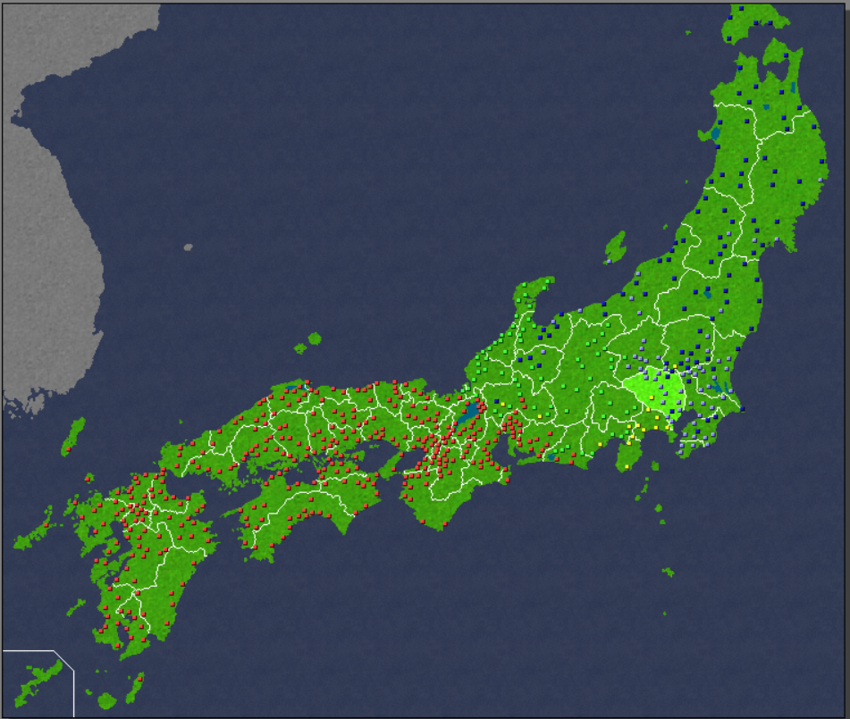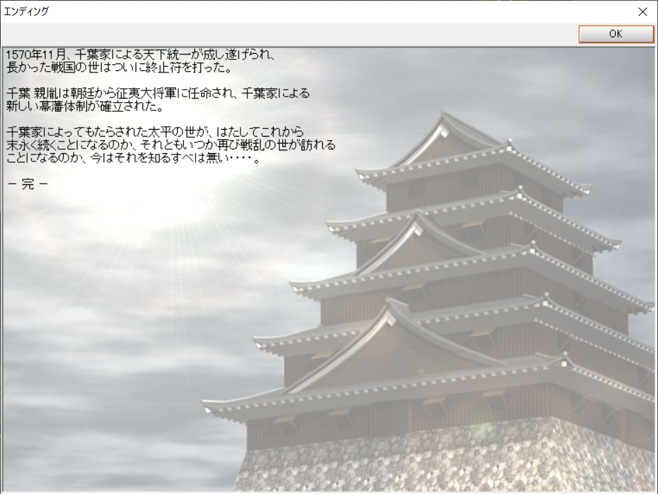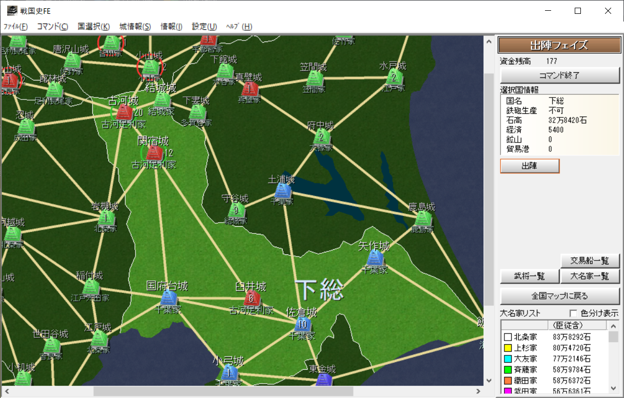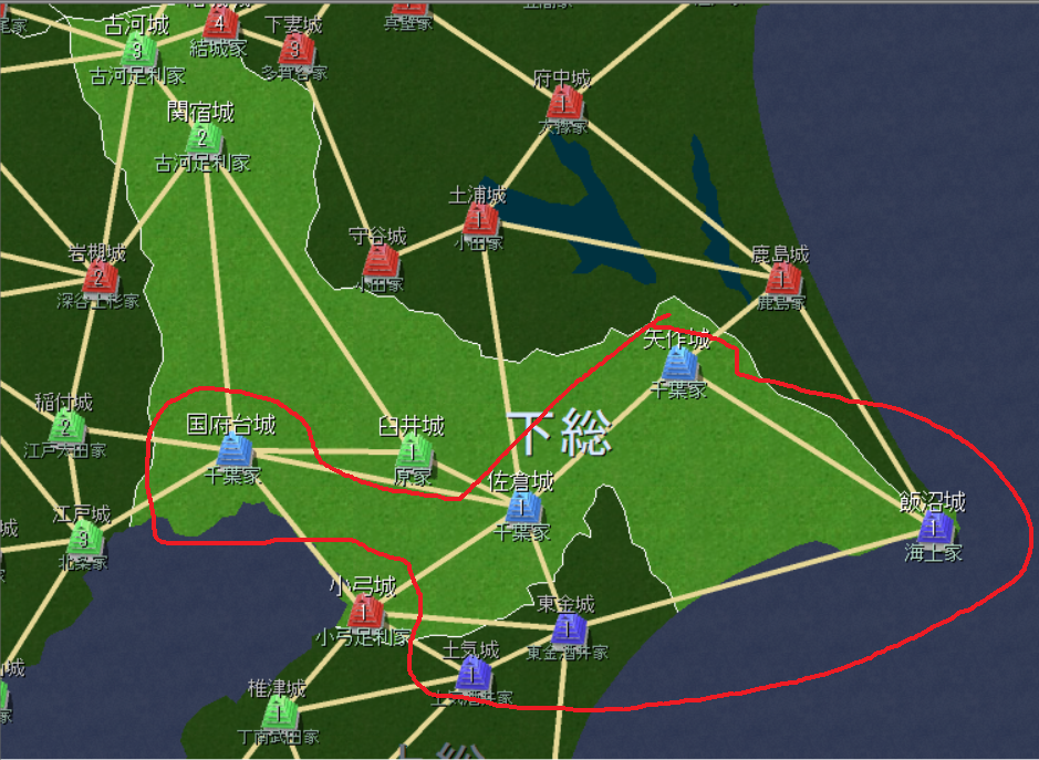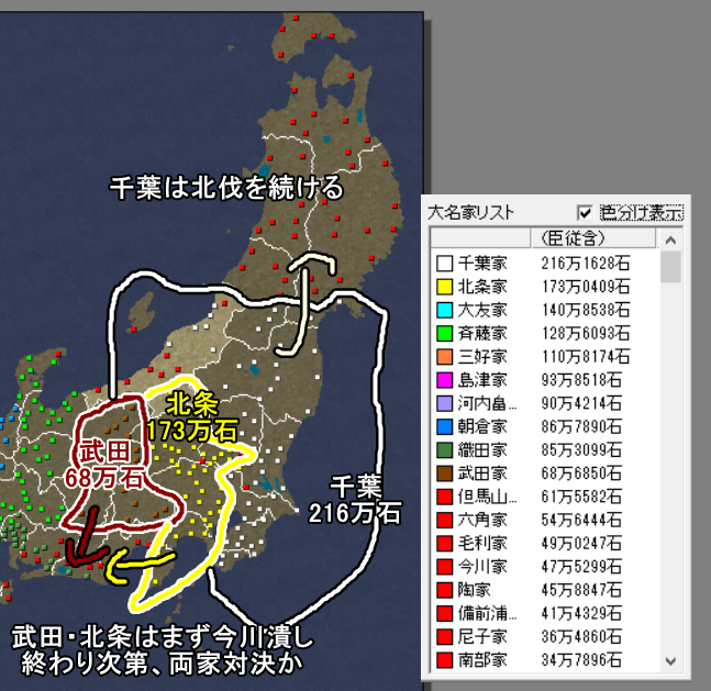 上杉家を従属、次ターンに臣従。東北勢は千葉家が睨み付けるだけで降伏する始末。
