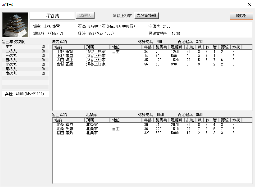 深谷城があと3ターンで落ちる。11月は台風が発生しないので、10月に台風が関東直撃するよう願う(リロードする)のみ。