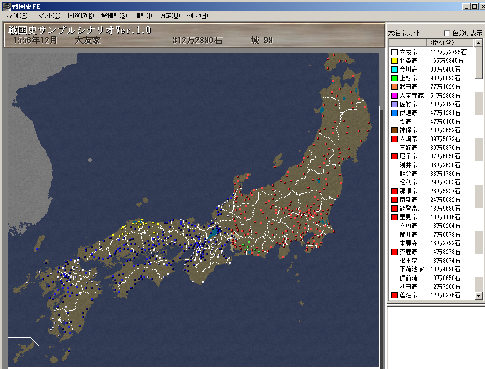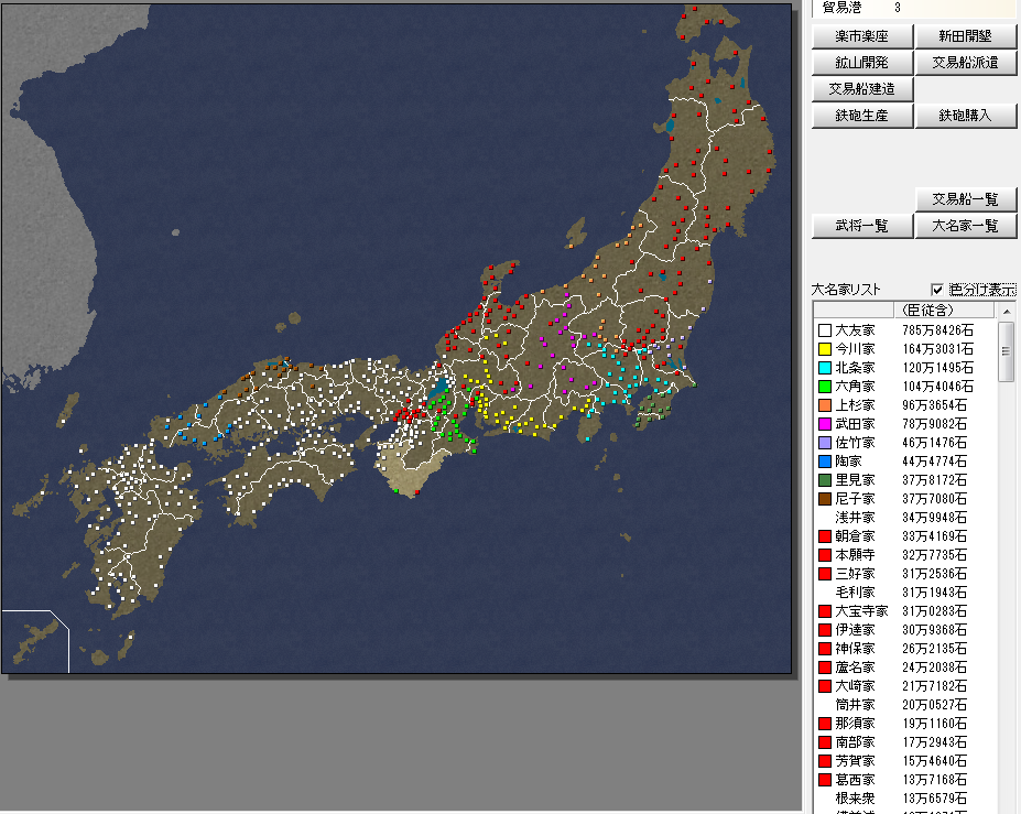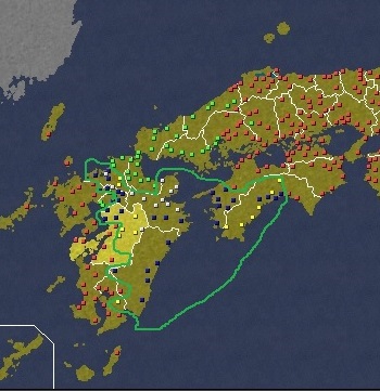 九州に領土を持っている大名だと、25位の島津家、34位の阿蘇大宮司家が大友の次に来る(大内傘下の豊前杉家が27位)。その点、大友家は鳥なき島の蝙蝠な故、九州統一が容易いと考えられる。ちなみに九州全域で200万石に達し、この国力なら天下統一も簡単である。