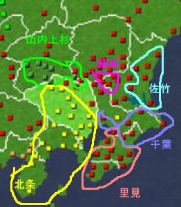 言ってしまえば「北条vsそれ以外」に尽きる。北条家は周囲(上図のうち、山内・佐竹・里見が宿敵。ほかに深谷上杉・古河足利・宇都宮と、(越後)上杉も)を宿敵に囲まれているが、地力では北条が上回るため北条家が関東を制圧する。