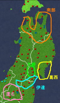 大きい勢力と言えば、南部家(臣従含44000石)、葛西家(50000石)、大崎家(45000石)、伊達家(臣従含95000石)、蘆名家(臣従含92000石)が目立つ程度で、それも関東以東の勢力からすればごく小さいレベル。