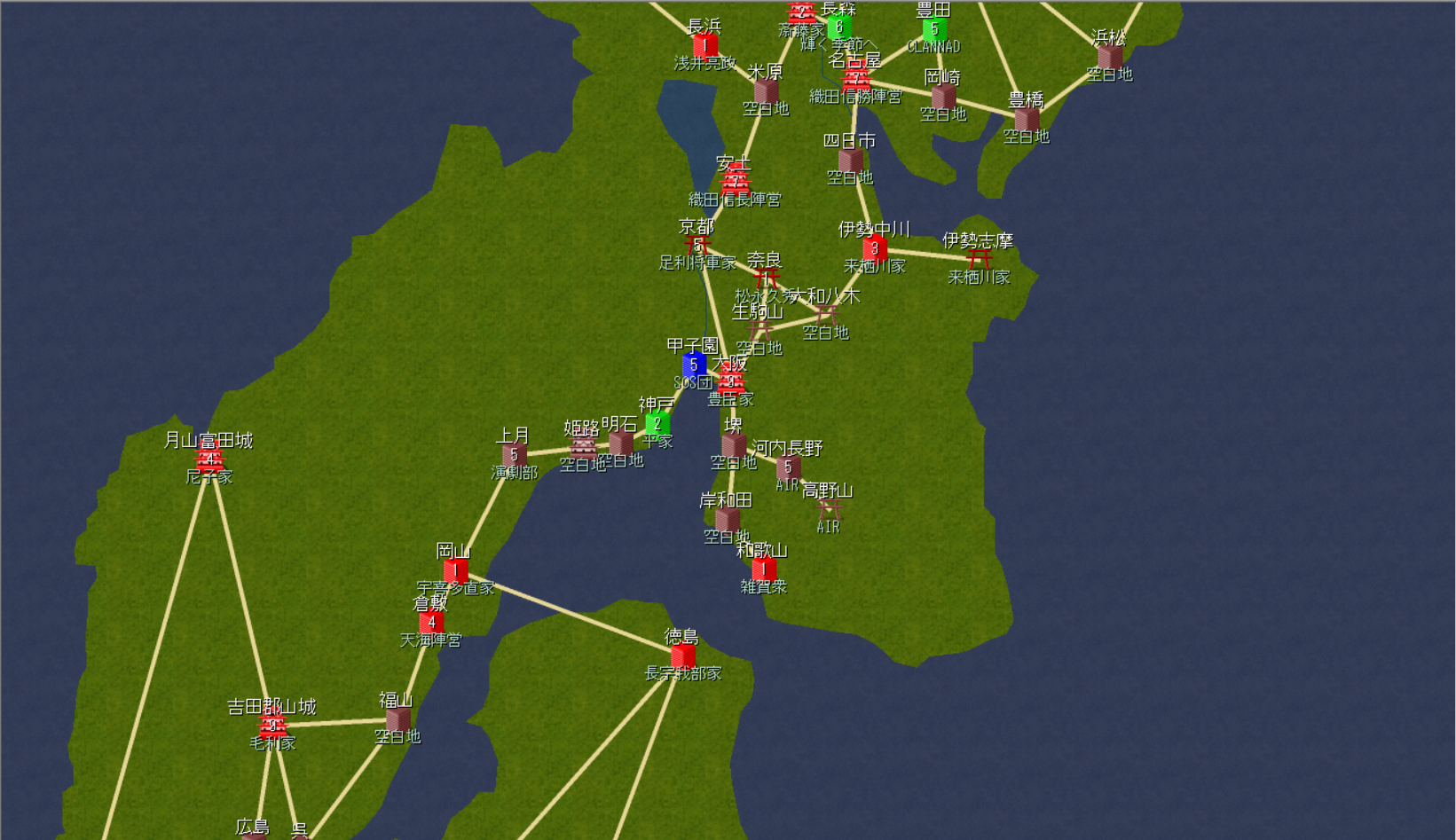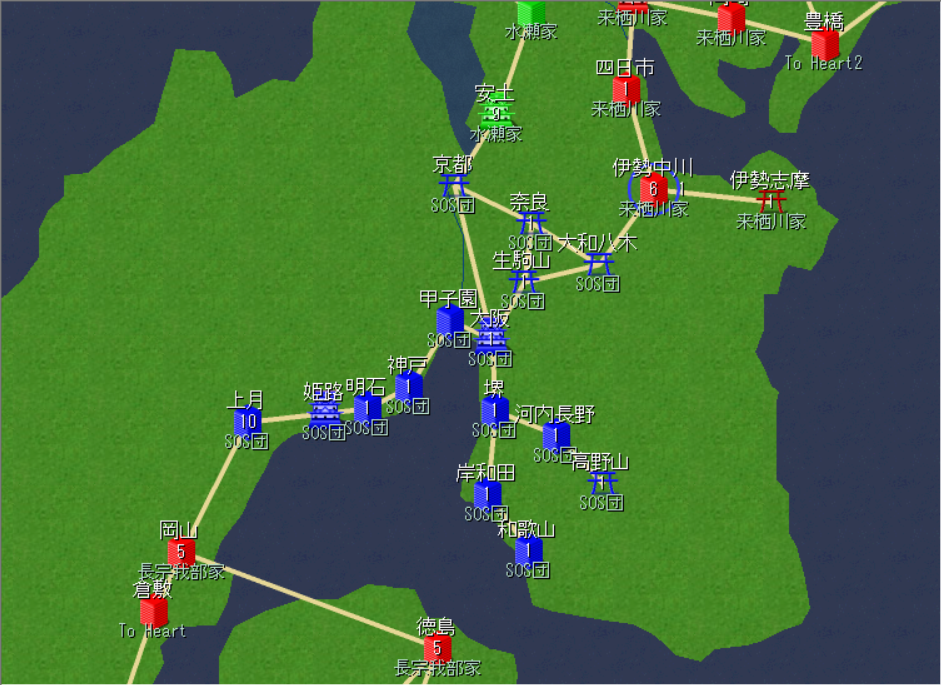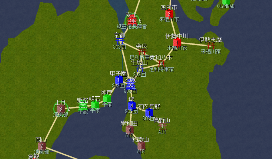 2000年2月。河内長野を制圧。これでようやく徴兵可能に。安土は同盟の永瀬家(Kanon)が包囲。