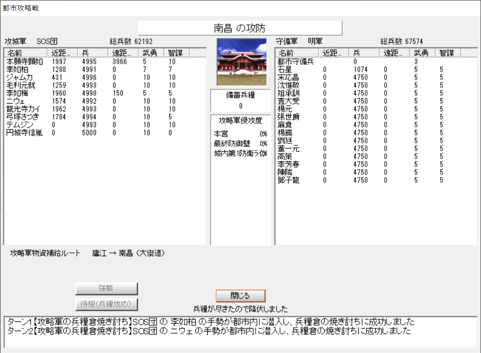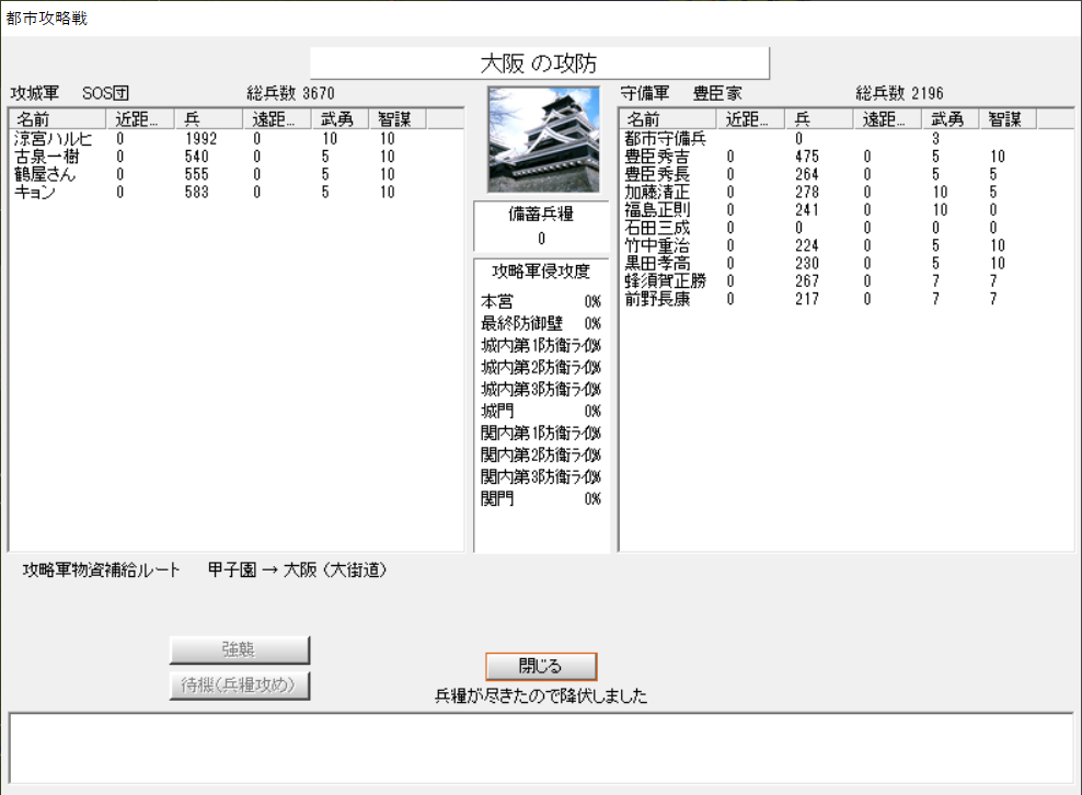 いかんせん兵糧や守備兵不足というので、不退却と強襲であっさり倒せた。