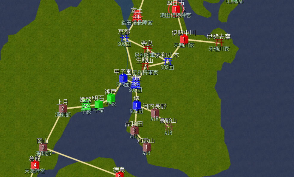 西の平家(神戸)は同盟、東の大阪(豊臣家)は敵対。