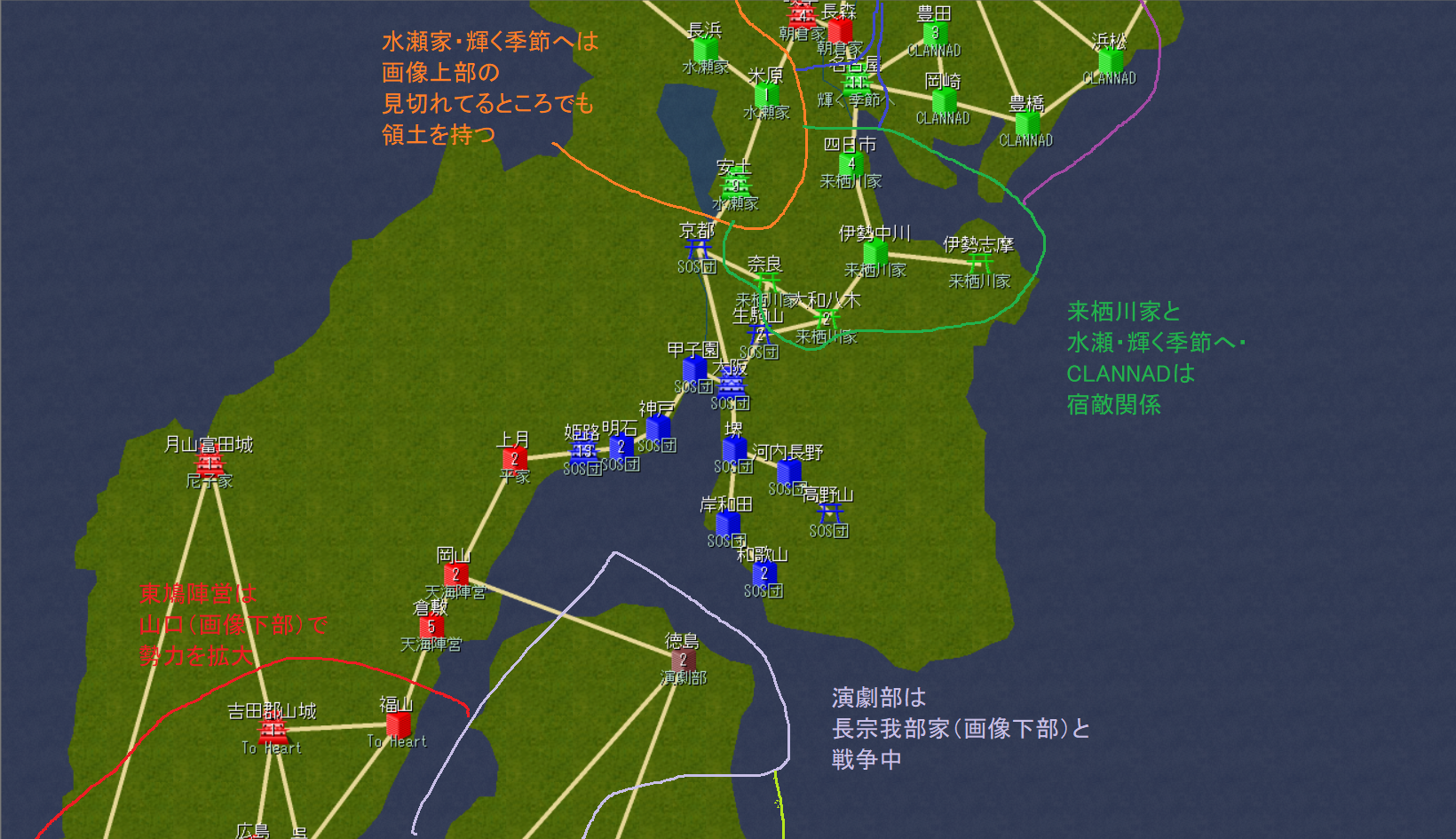 西方の平家・天海陣営らはもはや敵ではないだろう。もっと西のTo Heart(以下「東鳩」と表記)は着実に力を付けている。同盟が結べればいいが、そうでなければ難しい。