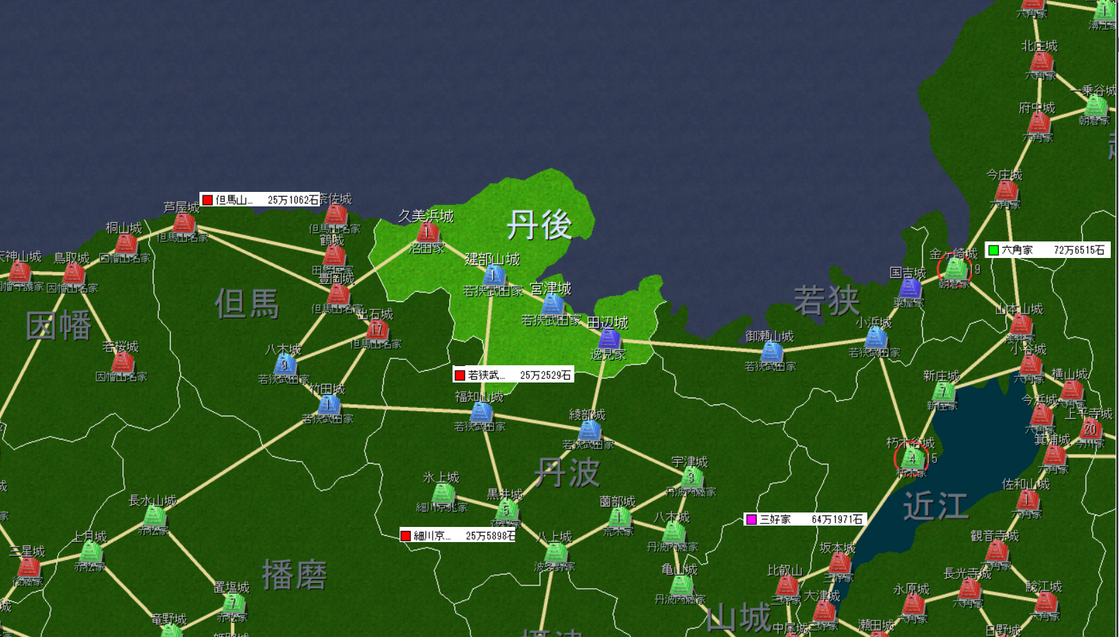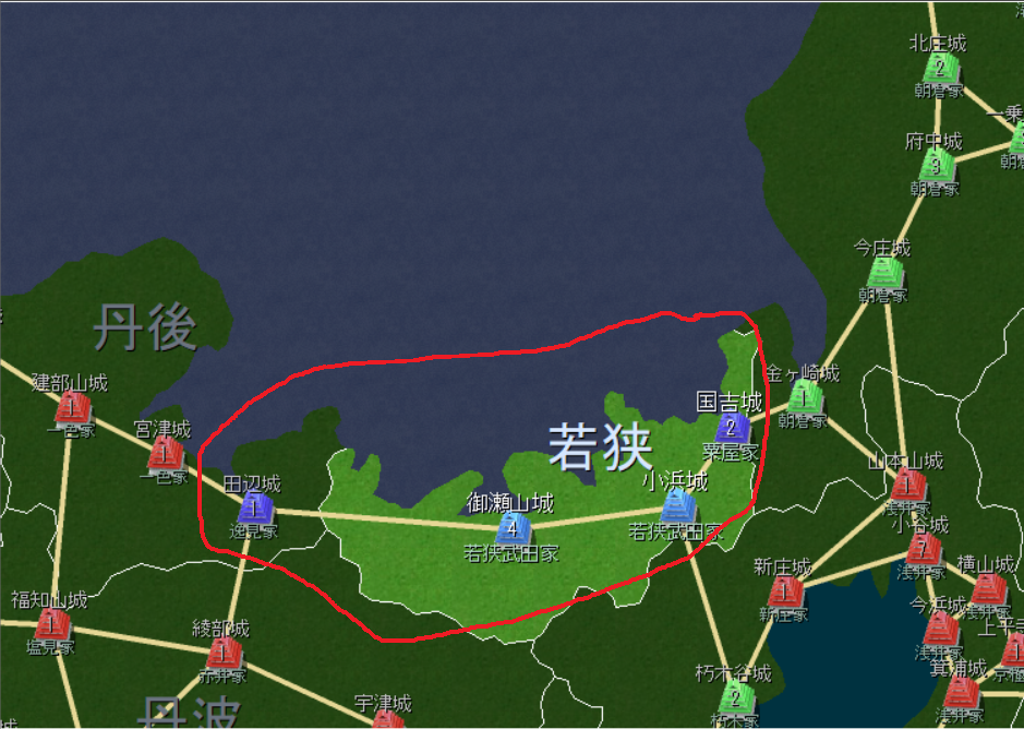 若狭武田19万石、対し但馬山名29万石。但馬山名に隣接するのは尼子28万石と備前浦上21万石。秋まで粘ったとしても同盟を結ぶのは厳しそう。