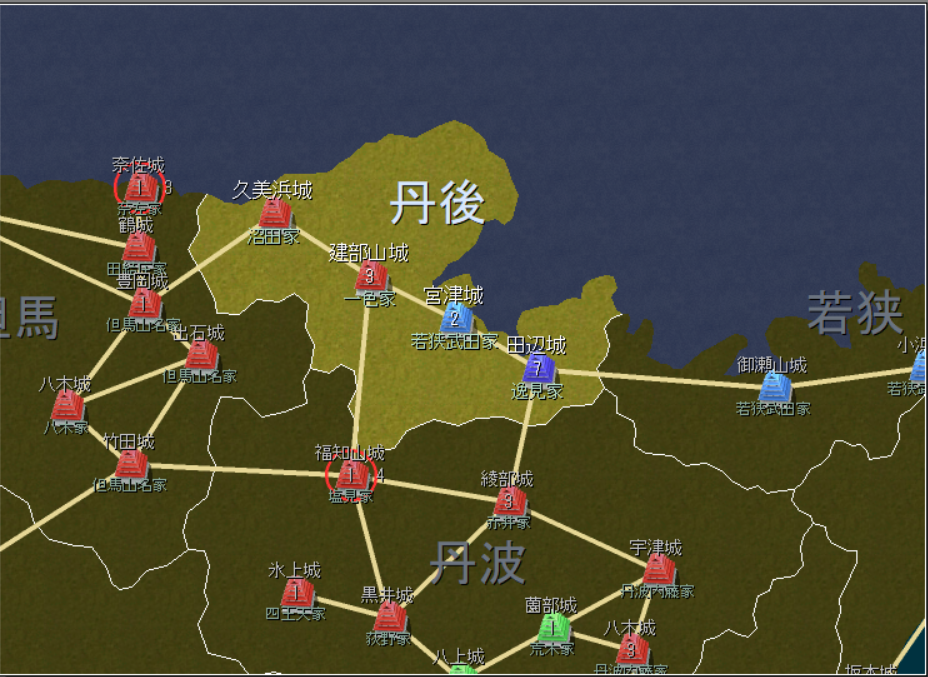 若狭武田は黒字だが、但馬山名は夏場には赤字に転落する。しかも臣従の国人が多いので、兵力を一点にまとめにくい。このことも有効活用し、なんとか若狭武田は優位に立ちつつあった。
