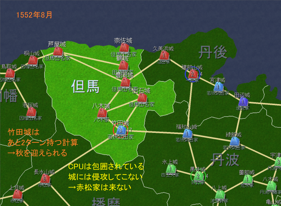 出石城の部隊は竹田城に侵攻したが、兵力をある程度置いており、2ターンは持つ計算だ。